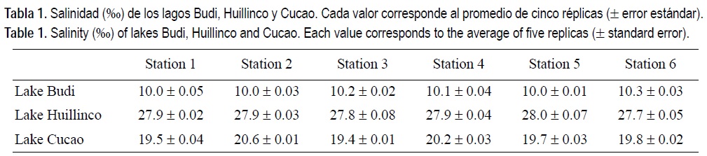 La salinidad media de los lagos Budi, Cucao y Huillinco fue de alrededor de 10 ± 0.04, 20 ± 0.14 y 28 ± 0.03 (promedio ± error estándar), respectivamente, y no mostró variación significativa entre las estaciones de cada lago (tabla 1).