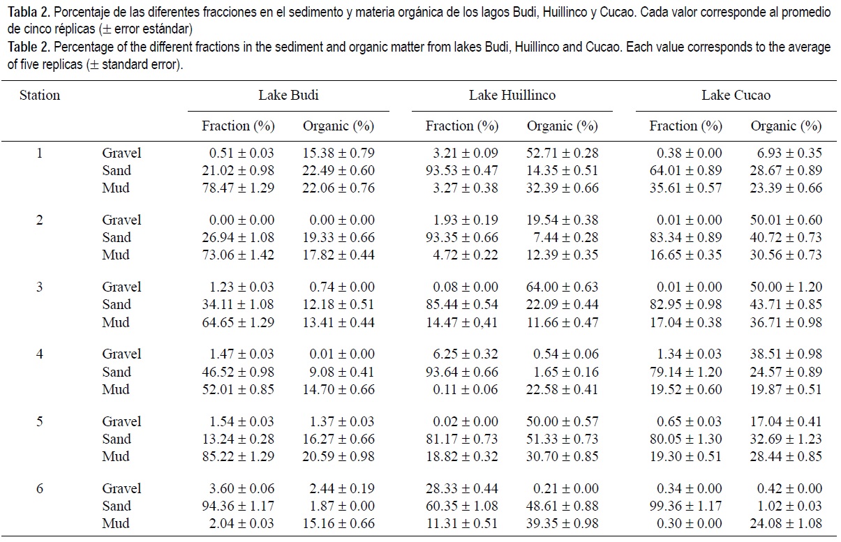 En el Lago Budi, el fango (limo y arcilla) fue la fracción predominante en casi todas las estaciones, comprendiendo más del 50% del contenido total. En los dos lagos en Chiloé, la fracción de arena fue la mejor representada, alcanzando valores ceranos al 90% en algunas estaciones, especialmente en el Lago Huillinco (tabla 2).