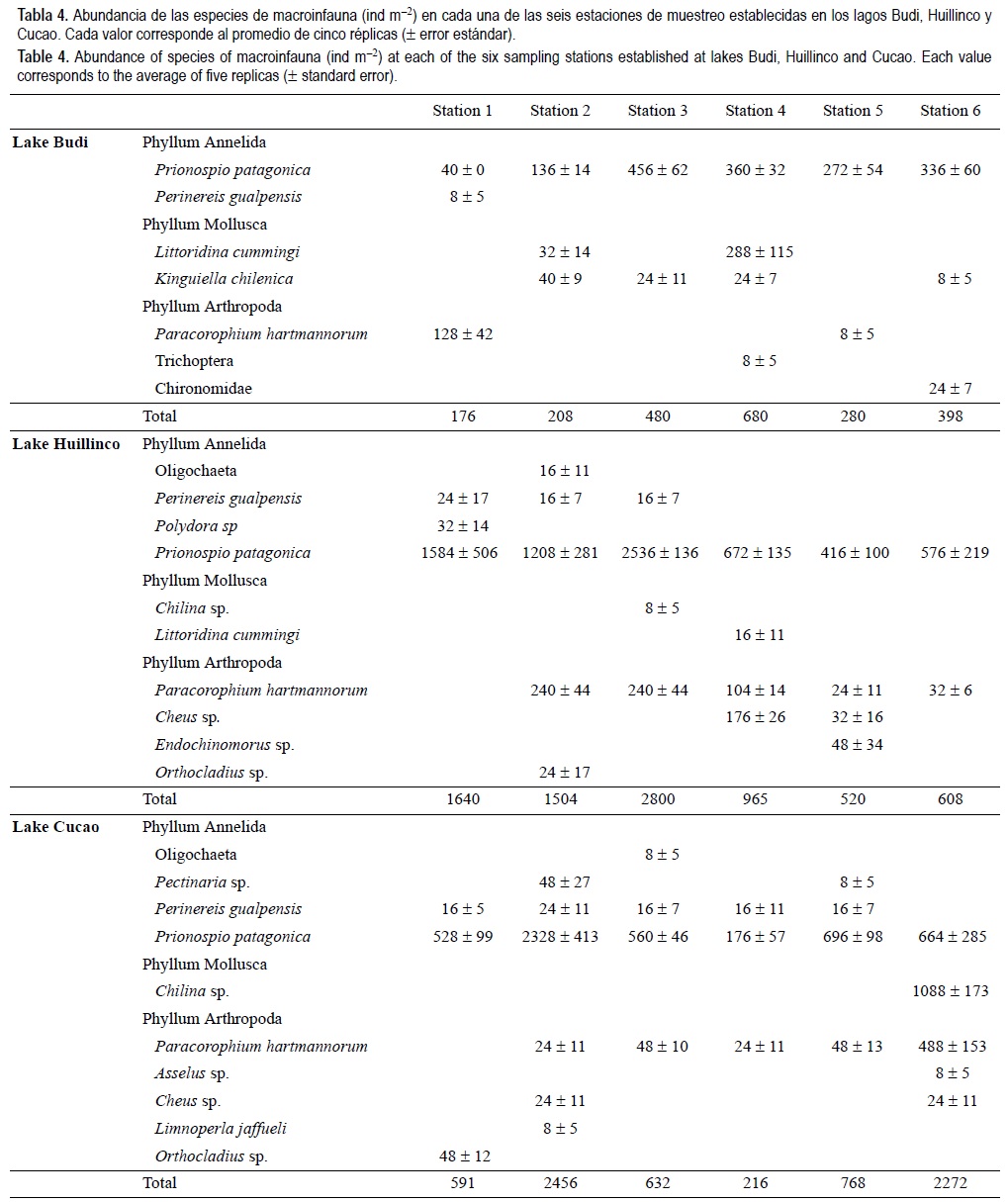 La macrofauna del Lago Budi estuvo constituida por 7 taxones, pertenecientes a los filos Annelida (2), Arthropoda (3) y Mollusca (2), siendo las especies Prionospio patagonica (Polychaeta, Spionidae) y Littoridina cummingi (Mollusca, Cyamiidae) las más abundantes. La mayor densidad registrada por estación de muestreo fue 680 ind m-2 en la estación 4 (tabla 4). En los lagos Huillinco y Cucao se encontraron 10 especies de macrofauna, distribuidas entre los filos Annelida, Arthropoda y Mollusca. Las especies más abundantes fueron P. patagonica (Polychaeta, Spionidae) y Paracorophium hartmannorum (Crustacea, Corophiidae). La mayor densidad por estación de muestreo fue 2800 ind m-2 en la estación 3 del Lago Huillinco y 2456 ind m-2 en la estación 2 del Lago Cucao (tabla 4).
