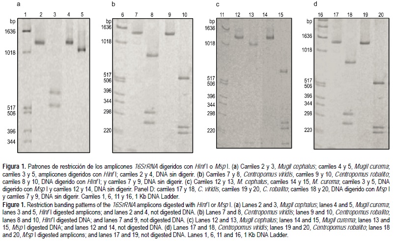 Los amplicones de DNA mitochondrial de ~1.3 Kb para los genes 16SrRNA y COI fueron obtenidos individualmente de cinco especímenes de cada una de las cuatro especies estudiadas. En todos los casos, solo se detectó un amplicón, lo que indica que la amplificación fue gene-específica (fig 1). La digestión con las enzimas de restricción Hinf I y MspI produjeron exactamente el mismo patrón en los cinco individuos por especie; sin embargo, los patrones de bandeo fueron diferentes entre las cuatro especies (fig 1). La digestión del amplicón 16SrRNA de M. cephalus con Hinf I produjo dos fragmentos claramente diferentes de 565 y 675 pb, mientras que para M. curema se obtuvo un fragmento de 953 pb y 3 fragmentos más pequeños que fueron muy tenues en el gel debido a su tamaño (fig. 1a). Los patrones de restricción del 16SrRNA con Hinf I de los robalos presentan 3 bandas para cada especie, pero todas de tamaño diferente: 812, 284 y 236 pb para C. viridis, y 542, 227 y 200 pb para C. robalito (fig. 1b). Los patrones de bandeo obtenidos con Msp I también fueron apropiados para distinguir las cuatro especies estudiadas (fig. 1c, d). Por otro lado, los patrones de bandeo de los amplicones de COI fueron especie-especificos con ambas enzimas de restricción (datos no mostrados). Estos resultados concuerdan con reportes de patrones de bandeo diferentes obtenidos de fragmentos de genes mitocondriales de peces (Céspedes et al. 1999) e identificación de especies de ostiones, a pesar del alto grado de conservación de las secuencias mitocondriales (Klinbunga et al. 2003).