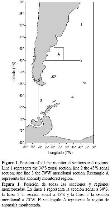 Para analizar la variabilidad del océano en la CBM, se estimaron campos dinámicos y termodinámicos. Estas estimaciones se obtuvieron mediante el análisis de sólo dos experimentos diferentes: un experimento climático y uno de perturbación (esfuerzo del viento simulado de un evento de ENOS). Las anomalías se estimaron como las diferencias entre los dos experimentos. Estos campos se analizaron en la capa superior (<100 m) para secciones verticales zonales situadas al norte y al sur de la región de la CBM en los paralelos 30°S (sección 1) y 45°S (sección 2) (fig. 1). También se analizó una sección meridional (sección 3) situada en el Pasaje de Drake (70°W). Las ubicaciones de las tres secciones fueron justificadas por el flujo bien definido de la corriente en estas regiones, así como por la presencia de datos observados y de estimaciones de transporte disponibles en la literatura. También se realizó un análisis del rectángulo definido por las latitudes 40°S45°S y las longitudes 57°W52°W (rectángulo A, fig. 1).