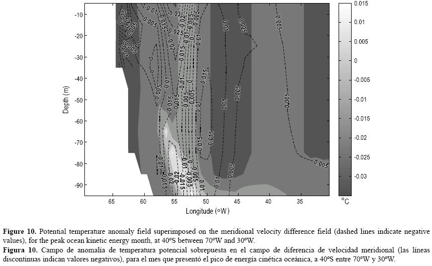 En la figura 9 se presenta el campo de la anomalía de temperatura superficial en la región suroeste del Atlántico sobrepuesta en el campo vectorial de la diferencia de velocidad de 5 m para el mes que presentó el pico de energía cinética oceánica. La circulación residual muestra una intensificación en el transporte superficial de volumen hacia el sur asociado con la CB y una pequeña celda de circulación anticiclónica cerca de la boca del Río de La Plata, marcada con anomalías positivas de temperatura. Estos resultados corroboran los aspectos dinámicos y termodinámicos descritos anteriormente. En la figura 10, una distribución zonal vertical de las anomalías de temperatura fue sobrepuesta en el campo de anomalía de velocidad meridional a 40°S, entre 70°W y 30°W. La circulación meridional anticiclónica quedó confinada, aproximadamente, entre 58°W y 52°W. Esta circulación fue inducida por el bombeo de Ekman negativo (hacia abajo) que fue responsable de los valores positivos de las anomalías de temperatura tanto en las capas superficiales como en las subsuperficiales, entre 70 y 100 m. De hecho, las anomalías de viento inducidas por ENOS son muy importantes en la generación de las anomalías de temperatura en la capa superior del océano, al alterar el transporte de Ekman meridional y los procesos de bombeo (Colberg et al. 2004).