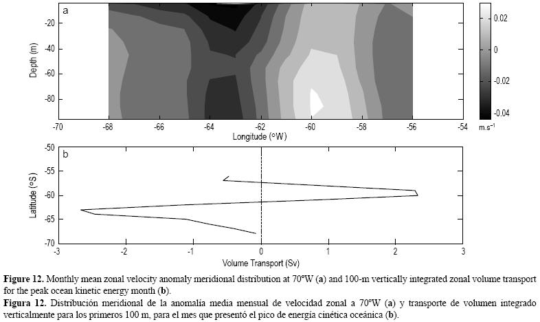 En los primeros 100 m, se registraron valores positivos de anomalía de velocidad zonal en la parte norte del Pasaje de Drake y valores negativos en la parte sur (fig. 12). El transporte de volumen integrado verticalmente para los primeros 100 m indicó un incremento en el transporte de volumen de la capa superior del lado norte del pasaje y un fuerte decremento en el lado sur. Este comportamiento se relaciona con una disminución en el flujo de la CM durante el mes del pico de energía cinética. Algunos autores han sugerido que la intensidad de la CM está relacionada con la intensidad de la CCA en la región del Pasaje de Drake (Olson et al. 1988, Matano 1993, Gan et al. 1998, Vivier y Provost 1999).