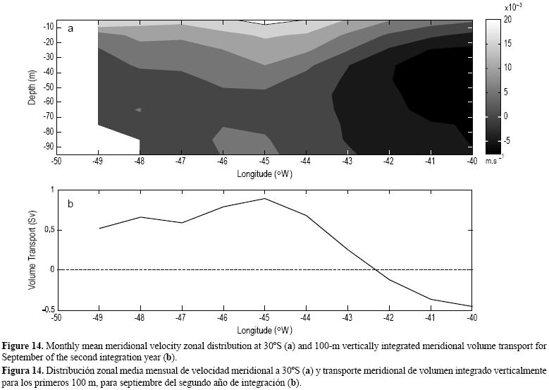Los principales rasgos oceánicos relacionados con los flujos en la cuenca del Atlántico Sur asociados con la dinámica y termodinámica de la región de la CBM fueron representados por el modelo. El modelo también reprodujo exitosamente aspectos estacionales importantes de la circulación del Atlántico Sur. Se obtuvieron un incremento en el volumen de la CB transportado durante los meses del verano austral y un decremento de esta propiedad durante los meses del invierno austral. Este comportamiento de la capa superior es una respuesta al aumento en la circulación atmosférica a nivel bajo asociada con el giro anticiclónico subtropical atmósferico. Este rasgo atmosférico se acerca a la costa sudamericana y se intensifica durante el verano austral cuando los vientos del este y noreste prevalecen entre las latitudes 15°S y 35°S; durante el invierno austral, por debajo de 25°S, los vientos del oeste y suroeste prevalecen cerca de la costa (Castro y Miranda 1998). Se registró un valor medio anual de 3.619 Sv para el transporte meridional de volumen integrado verticalmente para los primeros 100 m.