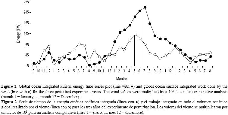 Como condiciones iniciales del segundo experimento, se utilizaron los campos medios mensuales dinámicos y termodinámicos de septiembre generados por el experimento climático pero con condiciones de frontera anómalas del esfuerzo del viento. Estas condiciones de frontera anómalas fueron representadas por las medias mensuales de los campos globales del esfuerzo del viento generados por un experimento usando un MCGA (Torres Jr 2005). El MCGA se ejecutó por tres años y utilizó condiciones de frontera basados en el evento de ENOS de 19821983. El modelo oceánico se ejecutó por 36 meses. El análisis de estos resultados se enfocó en el segundo año de integración y específicamente en el vigésimo tercer mes de la integración del MCGO. Este mes representa el pico de energía cinética del océano. Es importante enfatizar que se observaron anomalías dinámicas y termodinámicas antes y después del pico de energía cinética. La figura 2 presenta la serie de tiempo de la energía cinética oceánica global integrada y del trabajo integrado global realizado por el viento. El análisis de esta figura muestra el comportamiento transitorio de este experimento, donde la curva de la energía cinética oceánica global sigue la curva del trabajo integrado global realizado por el viento con un retraso de tiempo pequeño.