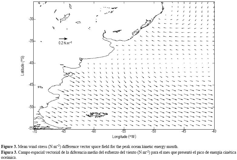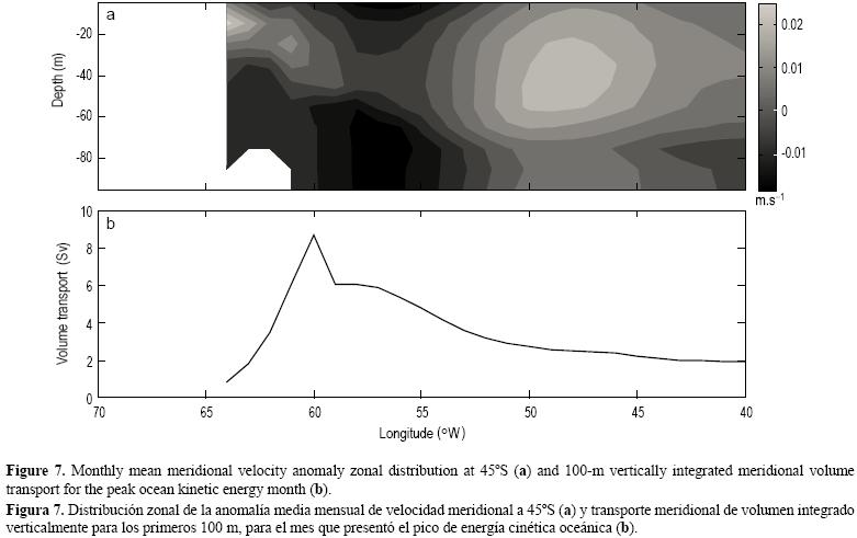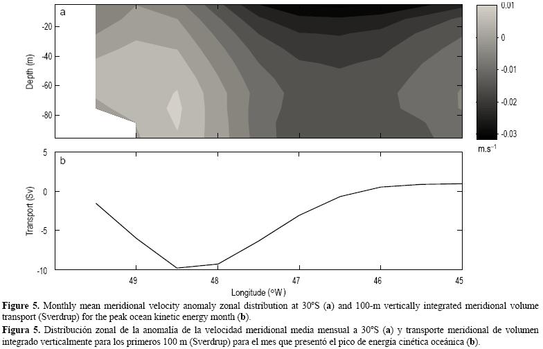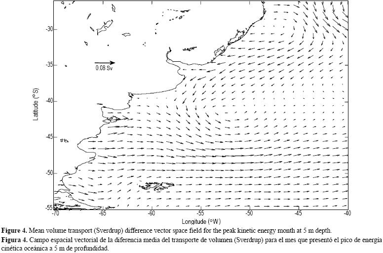 El campo de esfuerzo de viento perturbado que se utilizó para forzar el modelo oceánico presentó cambios importantes relacionados con la circulación atmósferica a bajo nivel en la cuenca del Atlántico Sur; e.g., la intensificación del giro subtropical anticiclónico y la corriente de aire con dirección hacia el este entre 40°S y 55°S. La figura 3 muestra el campo espacial vectorial de la diferencia media del esfuerzo del viento para el mes que presentó el pico de energía cinética oceánica. Esta intensificación produjo un aumento en el transporte superficial de volumen asociado con el flujo de la CB en la región suroeste del Atlántico (fig. 4). Esto no sólo se observó en la capa superficial sino también en las capas subsuperficiales del océano. La figura 5 muestra valores bajos de las anomalías negativas de la velocidad meridional cerca de la costa y en las regiones mar adentro durante el mes que presentó el pico de energía cinética oceánica. En la figura 5 también se presenta la distribución zonal del transporte meridional de volumen integrado verticalmente para los primeros 100 m. Esta distribución muestra un mayor transporte meridional de volumen hacia el sur asociado con el flujo de la CB.