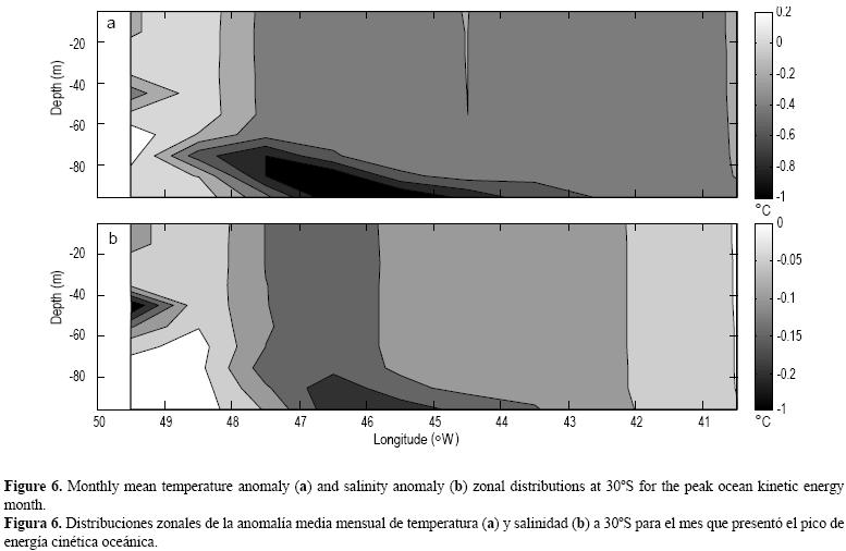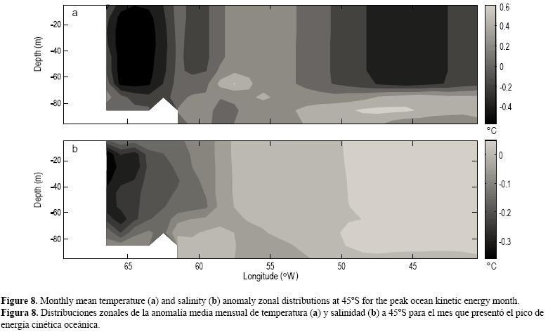 La figura 6 muestra las distribuciones zonales verticales de las anomalías de temperatura y salinidad a 30°S para el mes que presentó el pico de energía cinética oceánica. En esta figura, cerca de la costa, se observan anomalías positivas de temperatura (0.0°C < AT < 0.2°C) y salinidad (0.01 < AS < 0.04) en la capa superior de 100 m y especialmente en los primeros 50 m. Este hecho probablemente esté asociado con una intensificación en el transporte de volumen de la CB hacia el sur durante este mes (fig. 7). Se realizó el mismo análisis para una sección zonal a 45°S, entre 70°W y 40°W. La figura 7 muestra que ocurrieron anomalías negativas de la velocidad meridional en las capas superiores entre 62°W y 52°W; esto indica una disminución en el transporte de volumen de la capa superficial hacia el norte asociado con el flujo de la CM. Entre 54°W y 42°W, los fuertes valores positivos de las anomalías de velocidad meridional indicaron una intensificación en el transporte de volumen hacia el norte que se relaciona con una celda de recirculación anticiclónica que acelera el flujo de la CB a aproximadamente 30°S, sobre la plataforma continental de Brasil (Peterson y Stramma 1991). La figura 8 muestra las distribuciones zonales verticales de las anomalías de temperatura y salinidad a 45°S para el mes del pico de energía cinética oceánica, así como las anomalías negativas de temperatura y salinidad en los primeros 100 m cerca de la costa (0.6°C < AT < 0.1°C y 0.4 < AS < 0.1). La presencia de estas aguas frías cerca de la costa en esta región está asociada con las aguas acarreadas por la CM o un mayor transporte del volumen superficial de mar adentro, a través de la plataforma. Cerca de la región del Río de La Plata se observa un núcleo de anomalías positivas, con valores oscilando entre 0.5°C y 1.0°C, centrado en 40.5°S y 55.0°W; su presencia se relaciona con un leve movimiento hacia el sur de la región de la CBM que puede explicarse por la intensificación del transporte superficial de volumen y calor asociado con el flujo de la CB, así como con la disminución del transporte de volumen de la CCA.