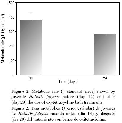 La tasa metabólica medida en los organismos del grupo B presentó una tendencia a disminuir, aunque no significativamente, después del tratamiento con OTC. Esta tasa decreció de 382 ± 52 µL O2 ind1 h1 (organismos infectados, no tratados) a 283 ± 20 O2 ind1 h1 después de dos semanas de iniciar el tratamiento (fig. 2).