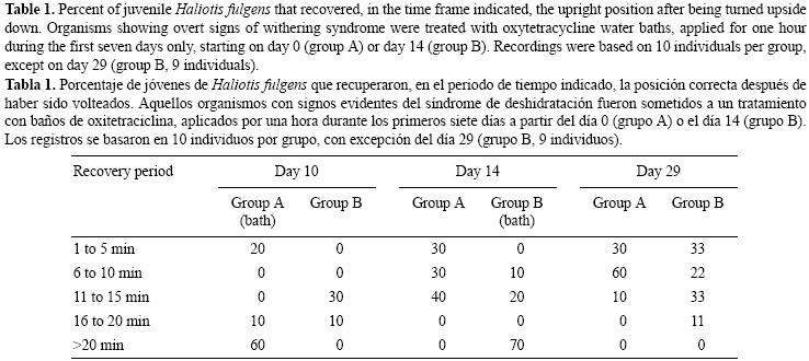 Se ha documentado que algunas formas de OTC tienen una biodisponibilidad limitada debido a sus propiedades quelantes o porque forman complejos con cationes polivalentes como Ca++, Fe++, Al+++ y Mg++ (Riviere y Spoo 1995); sin embargo, la forma de OTC empleada en el presente trabajo (clorhidrato de OTC) es fácilmente soluble en agua, y la solución se torna turbia por la liberación de la base de OTC en el agua (FDA 2006). Por lo tanto, es de esperarse que mientras el compuesto permanezca en la solución, éste estará disponible para que los animales lo capten por las branquias o lo absorban a través de la superficie corporal. Los resultados preliminares del presente estudio muestran que 1 h de baños de agua con OTC indujo la recuperación de abulones muy enfermos, según lo demuestran: (a) la capacidad de los abulones tratados de readherirse a las paredes de los recipientes tan solo tres días después de su aplicación, (b) la capacidad de reducir el tiempo necesario para voltearse y recuperar su posición normal, y (c) la disminución de la tasa metabólica. Esta capacidad de los abulones para recuperar su posición correcta ya ha sido utilizada como criterio práctico para evaluar el grado de recuperación en organismos postanestesiados (Aquilina y Roberts 2000, Chacón et al. 2003). Los datos obtenidos para ambos grupos A y B dos semanas después del tratamiento son similares a los valores documentados previamente para jóvenes sanos de H. fulgens (ca. 80% de recuperación en 20 min) de tamaño similar (2535 mm, Chacón et al. 2003), lo que sugiere que los organismos tratados con OTC (este estudio) recuperaron rápidamente su actividad motriz.