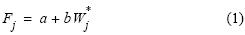 donde Wj* es el peso sin ovarios de la jésima hembra, y a and b son parámetros a estimarse mediante regresión lineal. La fecundidad parcial también se relacionó con el peso total sin ovarios de acuerdo al modelo potencial: