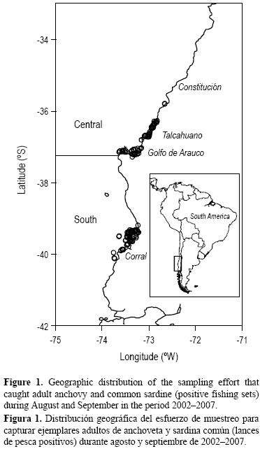En este artículo se seleccionó la fecundidad parcial para comparar las variaciones espaciales e interanuales en la anchoveta (Engraulis ringens) y la sardina común (Strangomera bentincki) frente a la costa centro y sur de Chile. Dichos clupéidos constituyen dos importantes recursos pesqueros desde el punto de vista comercial, con capturas que han fluctuado entre 424 mil toneladas y 1.091 millones toneladas en el periodo 20002007. Se pescan con redes de cerco, teniendo como puerto principal de desembarque Talcahuano (fig. 1). Al igual que otros pelágicos menores, la sardina común y la anchoveta son especies de crecimiento rápido, pero de vida relativamente corta («4 años, Aguayo y Soto 1978, Cubillos et al. 2001), maduración temprana al final de su primer año de vida (Cubillos et al. 1999), desovantes parciales de fecundidad indeterminada (Cubillos et al. 2007), y una mayor tasa de mortalidad natural (Cubillos et al. 2002).