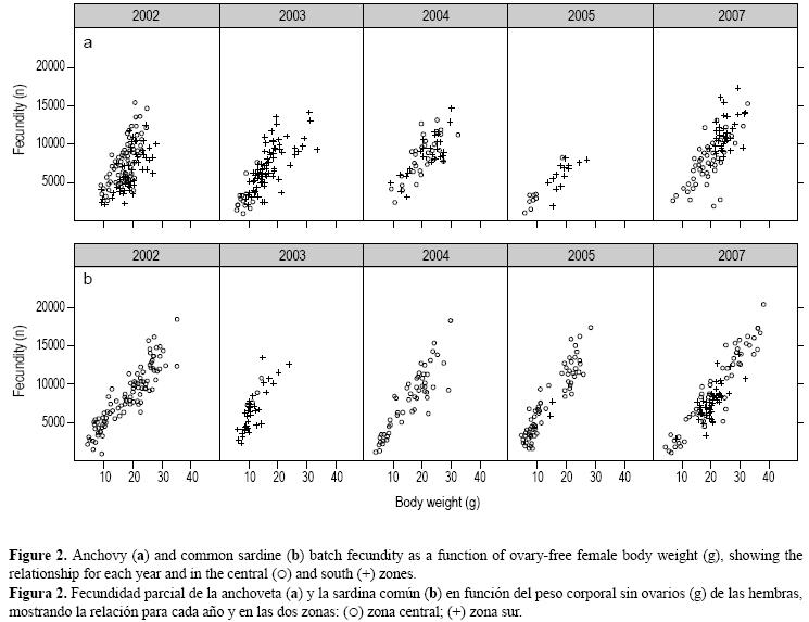 En el caso de la sardina común, la relación entre fecundiad parcial y peso corporal mostró diferencias interanuales en la pendiente y ordenada al origen de los modelos lineales. Desde un punto de vista estadístico la varianza alrededor de las líneas de regresión fue baja comparada con la de la anchoveta. Por ello, pequeños cambios en la distribución de la fecundidad parcial, derivados de ovarios muestreados en un año dado, pueden generar diferencias interanuales. Además, los cambios en la fecundidad relativa parecen ser la causa de la variación en la fecundidad parcial ya que algunas relaciones lineales son mejor descritas por dos parámetros (ordenada al origen y pendiente), mientras que otras son mejor descritas tan sólo por la pendiente (sin una ordenada al origen significativa).