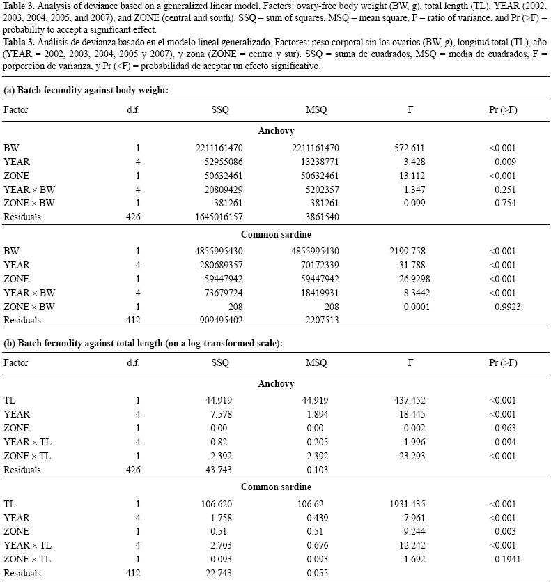 El MLG desarrollado para analizar la variación espacial y temporal de la fecundidad parcial no mostró ningún efecto significativo del año o la zona en las relaciones fecundidadpeso, ni en la anchoveta ni en la sardina (tabla 3). En cambio, el año si mostró un efecto significativo en las relaciones fecundidadlongitud para ambas especies, así como la zona para la sardina (tabla 3); sin embargo, no se observó variación espacial (P = 0.963) en el caso de las relaciones fecundidadlongitud para la anchoveta.