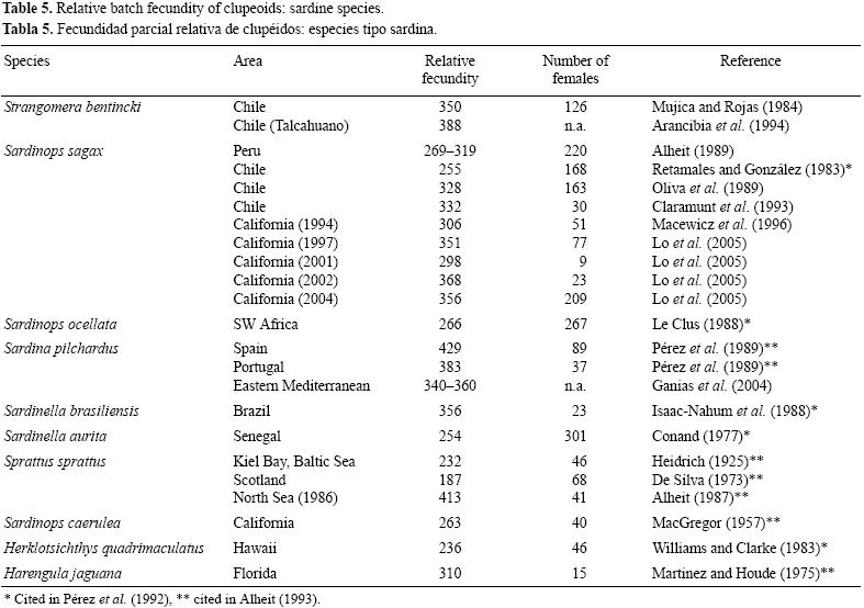 A pesar de la variación interanual en la fecunidad relativa parcial de la sardina común, el rango de 406 a 583 huevos g1 de peso corporal parece ser similar a las estimaciones disponibles para especies similares de los géneros Sardinops, Sardina, Sprattus y Sardinella (tabla 5). En contraste, el rango entre 376 y 434 huevos g1 de peso corporal de la anchoveta parece se menor en comparación con otras especies del mismo género como E. japonica, E. anchoita, E. capensis, E. encrassicolus y E. mordax, y aún con la misma especie en aguas peruanas y en el norte de Chile (tabla 6).