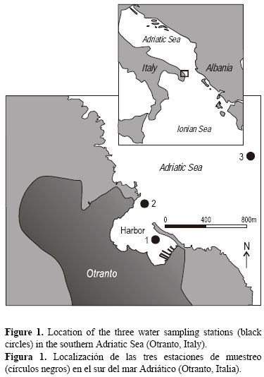 Se seleccionaron tres sitios de muestreo en una zona costera del sur del mar Adriático (fig. 1): el sitio 1, en la rada portuaria de Otranto, es impactado por las actividades navieras y protuarias, así como por la urbanización alrededor de la bahía; el sitio 2, a unos 20 m de la línea de costa, es impactado por la urbanización; y el sitio 3, a unos 1000 m mar adentro, no parece estar impactado. Se realizaron dos muestreos, el 14 y 24 de septiembre de 2007.