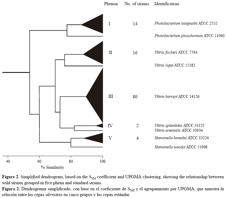 Se suprimieron diez pruebas de la matriz de datos ya que proporcionaron respuestas ya sea positivas (i.e., prueba de Kovacs para citocromo oxidasa, catalasa, O/F, movilidad) o negativas (i.e., Gram, producción de H2S) para todas las cepas examinadas. La matriz de datos final incorporó información de 116 cepas y 25 parámetros. El coeficiente de correlación cofenética (r) fue 0.95. Se definieron cinco grupos con valores de SSM >86%. Las bacterias del grupo I (SSM 86.7%) incluyeron 14 cepas catalasa negativa. Las características de estos aislamientos son similares a los descritos previamente para P. leiognathi ATCC 25521 (Nogi et al. 1998, Caccamo et al. 1999, López-Caballero et al. 2002). Las bacterias del grupo II (SSM 89.0%) incluyeron 16 cepas con un pigmento amarillo que presentan patrones bioquímicos idénticos a los de V. fischeri ATCC 7744 (Lunder et al. 2000). Las bacterias del grupo III (SSM 90.1%) incluyeron 80 cepas, cuyas características coinciden con las de V. harveyi ATCC 14126 (Yang et al. 1983, Farto et al. 1999). Las bacterias del grupo IV (SSM 96.0%) incluyeron dos cepas con características similares a las de V. splendidus biovar I ATCC 33125; los rasgos de este grupo concuerdan con la descripción de Farto et al. (1999) excepto para crecimiento a 35 °C, el cual es positivo para las cepas aisladas. Las bacterias del grupo V (SSM 88.0%) incluyeron cuatro cepas que muestran patrones bioquímicos idénticos a los descritos para S. hanedai ATCC 33224 (Makemson et al. 1997, Venkateswaran et al. 1999, Satomi et al. 2003).
