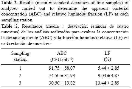 Las mediciones de las bacterias heterótrofas totales (CBA) y el componente de luminosidad relativa (FL) se muestran en la tabla 2. Los conteos de CBA en las localidades de muestreo variaron de 30.50 UFC mL-1 (sitio 3) a 91.75 UFC mL-1 (sitio 1) y los valores de FL de 5.44% (sitio 1) a 13.44% (sitio 3). El ANOVA de una vía mostró diferencias estadísticamente significativas al nivel de confianza de 99.0% entre los sitios 1 y 3 para los conteos de CBA así como los valores de FL.