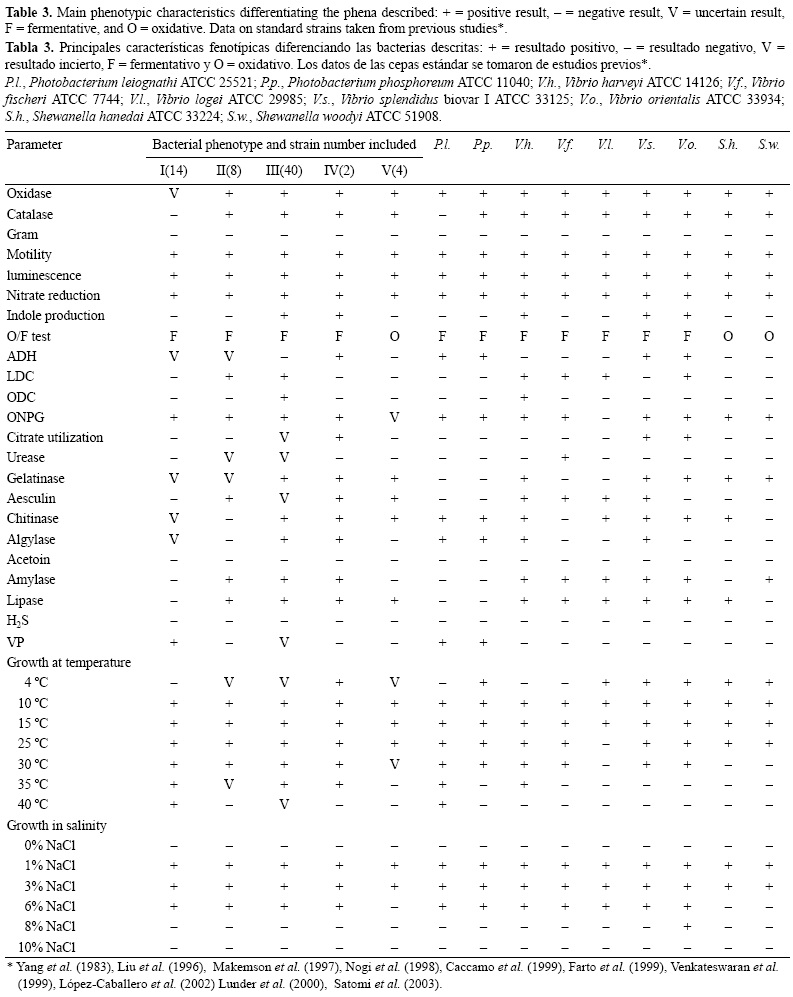 Se examinaron 36 características fenotípicas de todas las cepas mediante pruebas morfológicas, fisiológicas y bioquímicas. Se registraron las siguientes pruebas para todas las cepas: tinción de Gram; movilidad; catalasa; oxidasa (tiras de oxidasa, Oxoid); luminiscencia sobre agar de SWC; crecimiento después de 7 días a 4 °C y después de 2 días a 10, 15, 25, 30, 35 y 40 °C en caldo de soja tríptico (TSB) suplementado con 2% de NaCl; y tolerancia a la sal en caldo de NaCl al 0%, 1%, 3%, 6%, 8% y 10% (Pedersen et al. 1998).