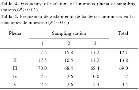 El análisis de frecuencia de aislamiento de bacterias luminosas (tabla 4) mostró que la distribución de especies luminosas fue similar en todos los sitios de muestreo (P > 0.01). Las bacterias del grupo III fueron las que se aislaron con mayor frecuencia, entre 68.4% (sitios 2 y 3) y 70% (sitio 1).