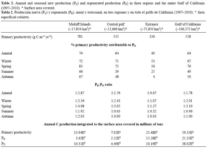 La PP total de un ecosistema está compuesta de la producción regenerada (PR), basada en la reutilización del nitrógeno reducido, producto de la respiración en la zona eufótica, más la producción nueva (PN), basada en la entrada de nutrientes nuevos (nitrógeno oxidado) (Dugdale y Goering 1967). Considerando que en el golfo de California los niveles estimados de productividad total más bajos fueron entre 0.36 a 0.43 g C m-2 d-1 durante verano (Hidalgo-González y Álvarez-Borrego 2001) y que White et al. (2007) establecen que bajo esas condiciones la producción básicamente se debe a la producción regenerada, se supone como primera aproximación a la realidad que cualquier valor por encima de esta PP de verano es atribuible a la PN.