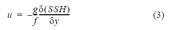 donde g es la aceleración de la gravedad, f es el parámetro de Coriolis, SSH es la altura absoluta del nivel del mar por encima del geoide y (y es la distancia entre las latitudes. Entonces,