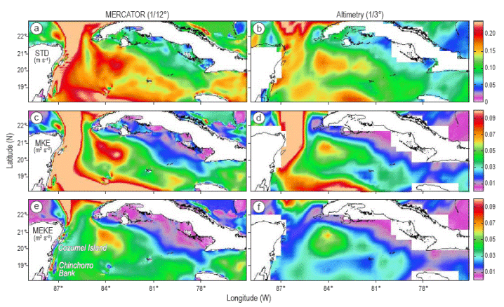En el recorrido de la CCC por el sur de Cuba, la mayor variabilidad (±0.15 a ±0.3 m s-1) fue observada al suroeste de la isla de Pinos, Cuba (Fig. 2a, b). La desviación estándar de MERCATOR mostró una alta variabilidad de la CCC, y los valores relativamente altos (±0.18 a ±0.2 m s-1) se observaron al noroeste y sureste de las islas Caimán, que coincidieron con la trayectoria de la CCC hacia Jamaica (Fig. 3a). Tanto MERCATOR como la altimetría mostraron los valores más altos de ECP en la cuenca de Yucatán, al suroeste de la isla de Pinos, excluyendo de este análisis a los máximos absolutos de ECP de la corriente del Caribe y la corriente de Yucatán (Fig. 2c, d). La ECRP fue alta (Fig. 2e y 2f), incluyendo dos máximos locales observados al norte de la isla de Cozumel y al oeste del banco de Chinchorro (Fig. 2e).