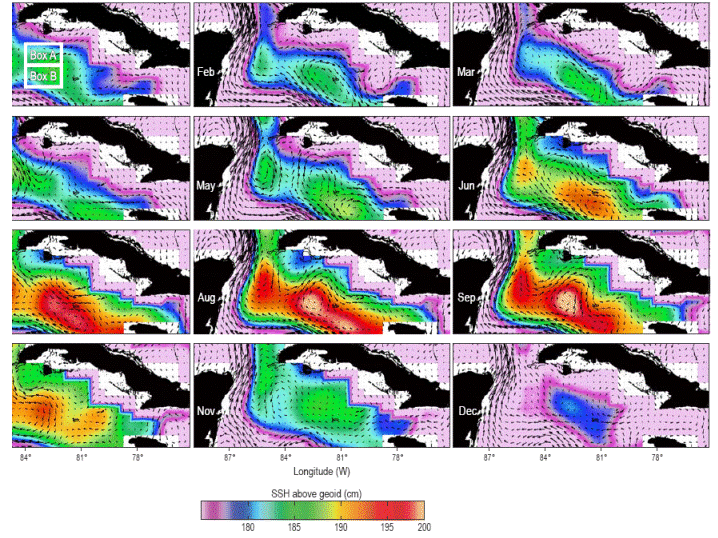 es el gradiente de la altura absoluta del nivel del mar con respecto a la latitud. De la ecuación (3), se dedujo la relación directa entre el incremento del gradiente de la altura absoluta del nivel del mar y el aumento de la velocidad geostrófica absoluta. De junio a septiembre, el gradiente horizontal de la altura absoluta del nivel del mar entre el centro de la cuenca de Yucatán y la costa sur de Cuba (cuadros A y B) aumentó de 0.1 m por 1º de latitud a 0.15 m por 1º de latitud, y ésto generó un aumento en la velocidad de la corriente de (0.1 m s-1 (de 0.25 a 0.35 m s-1) (Fig. 5b). Los valores mínimos de la velocidad se extendieron del otoño al invierno, y los mínimos absolutos de la velocidad zonal y meridional de la corriente superficial ocurrieron en noviembre (Fig. 5c). El ciclo anual de la temperatura superficial del mar (TSM) mostró una relación directa entre la formación de la alberca de agua cálida del Atlántico noroeste (TSM > 28.5 ºC, línea delgada en Fig. 5e) y los valores máximos de los parámetros antes mencionados.