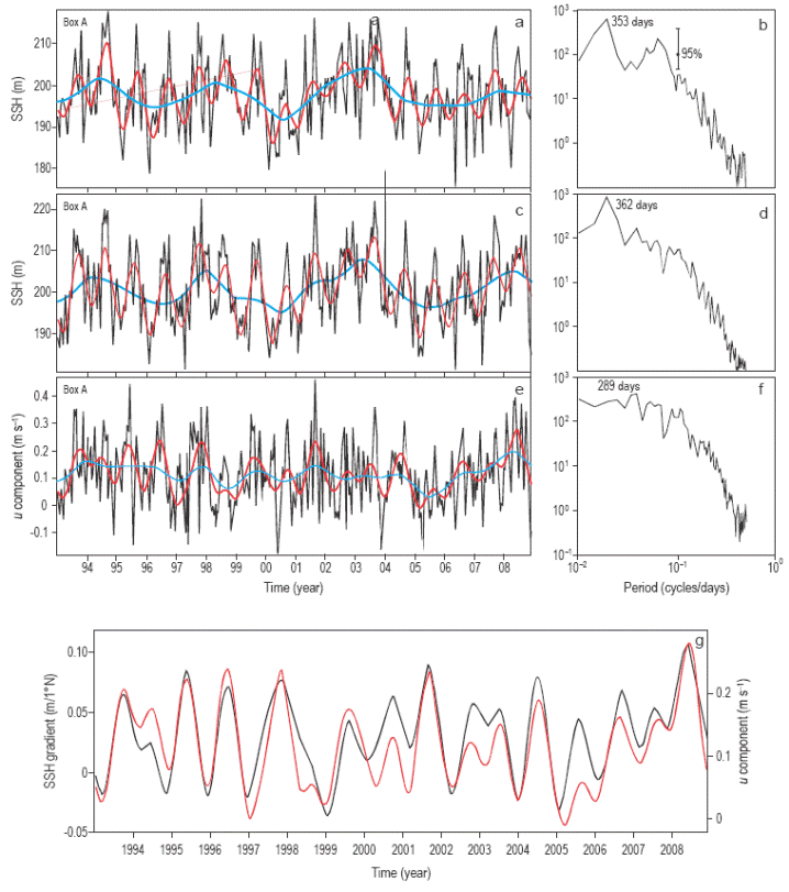 Figura 6 Serie de tiempo de (a, c) la altura del nivel del mar (SSH) promediada en los cuadros A y B, y (e) la velocidad zonal (u) en el cuadro A. (b, d, f) Análisis espectral de las series de tiempo de SSH y velocidad zonal. (g) Relación entre las series de tiempo filtradas del gradiente de SSH (línea negra) y la velocidad zonal (línea roja) usando un filtro de paso bajo de 280 días. La línea negra delgada (a-f) representa los datos brutos (resolución temporal de 7 días) y las líneas rojas y azules (a, c, e, g) los filtros de 280 y 700 días.