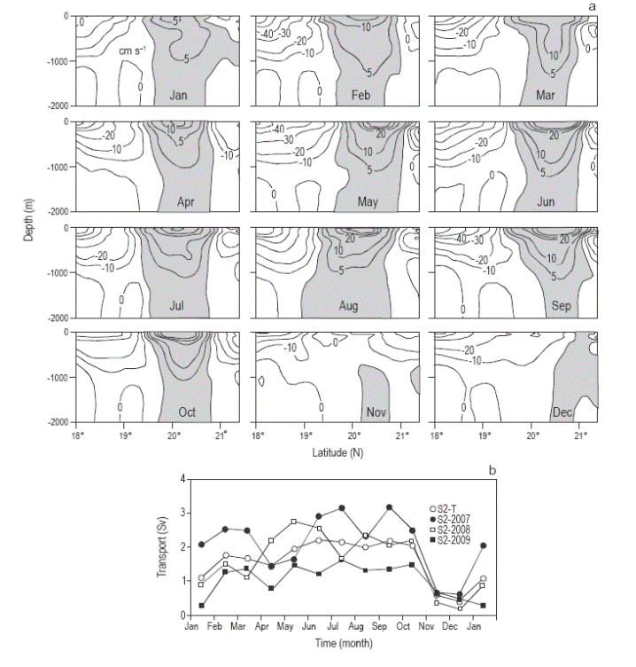 La posición vertical de la CCC al sur de Cuba no mostró gran variabilidad durante el ciclo anual (Fig. 7a, región sombreada de color gris). Excepto en noviembre y diciembre, cuando la rama superficial fue débil y en algunos momentos desapareció, la CCC fue observada siempre desde la superficie hasta los 2000 m de profundidad, y su anchura varió de (200 km (19º-21ºN) en agosto a menos de (100 km en noviembre y diciembre. Las velocidades máximas se registraron en los primeros 200 m de profundidad de mayo a octubre (20-35 cm s-1), y el máximo absoluto se registró en octubre (38 cm s-1). Durante este periodo se registró también el transporte máximo de la CCC, con un valor máximo absoluto de 2.23 ± 0.8 Sv en junio, mientras que los valores mínimos se registraron en noviembre (0.6 ± 0.5 Sv) y diciembre (0.4 ± 0.3 Sv) (Fig. 7b, serie S2). El ciclo anual del transporte, calculado para cada año por separado, mostró que 2007 (Fig. 7b, serie S2-2007) presentó los mayores valores del transporte en julio (3.1 (( 0.3 Sv) y septiembre (3.2 ( 0.4 Sv), mientras que la curva para 2009 (Fig. 7b, serie S2-2009) presentó los valores más bajos. Durante los tres años, el transporte mínimo ocurrió en noviembre y diciembre.