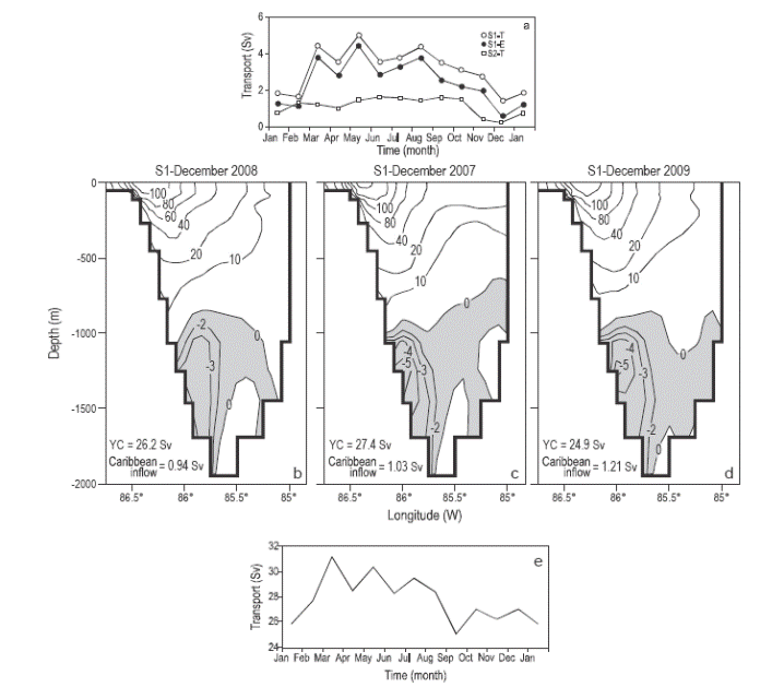 Figura 8 (a) Ciclo de transporte anual en la sección S1 (canal de Yucatán, YC) obtenido para el transporte total de agua al mar Caribe y el transporte por el lado este del canal de Yucatán (S1-E) a partir de datos del modelo MERCATOR para el periodo 2007-2009. Las curvas S1-T y S1-E se presentan con signo positivo para permitir su comparación con la curva S2-T que muestra el ciclo de transporte anual en la sección S2 (cuenca de Yucatán). (b, c, d) Velocidad meridional media mensual (cm s-1) durante diciembre de 2007, 2008 y 2009. (e) Ciclo de transporte anual para la corriente de Yucatán. El área sombreada (color gris, b-d) muestra el flujo hacia el sur.