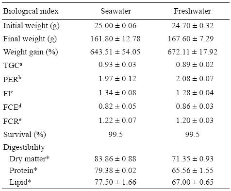 Table 2: Biological indices of juvenile hybrid tilapia (Oreochromis mossambicus x Oreochromis aureus) after being fed an experimental diet for 90 days in seawater and freshwater (mean ± standard deviation).