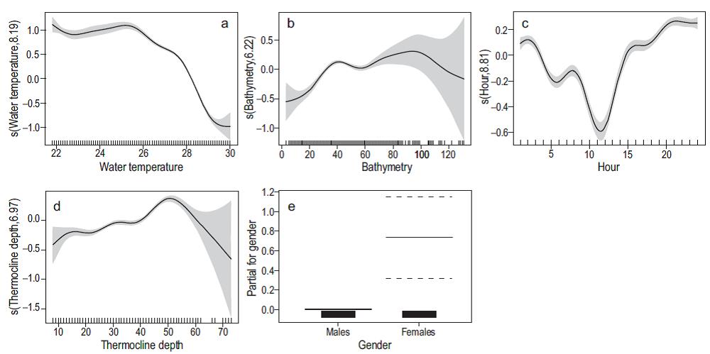 Figure 5: Generalized additive mixed models for vertical movements of Coryphaena hippurus. Plots show the effect of the explanatory variables (water temperature, bathymetry, hour, thermocline depth, and gender) on the response variable (fish depth). In (a-d), black tick marks above the x-axes indicate the distribution of data and the y-axes show the response variable on the scale of the linear predictor; the shaded areas indicate the standard error. In (e), the bars above the x-axis indicate the cumulative data for each gender, the thin horizontal lines indicate the value for the response variable (fish depth) on the linear predictor scale, and the horizontal dashed lines indicate the standard error.