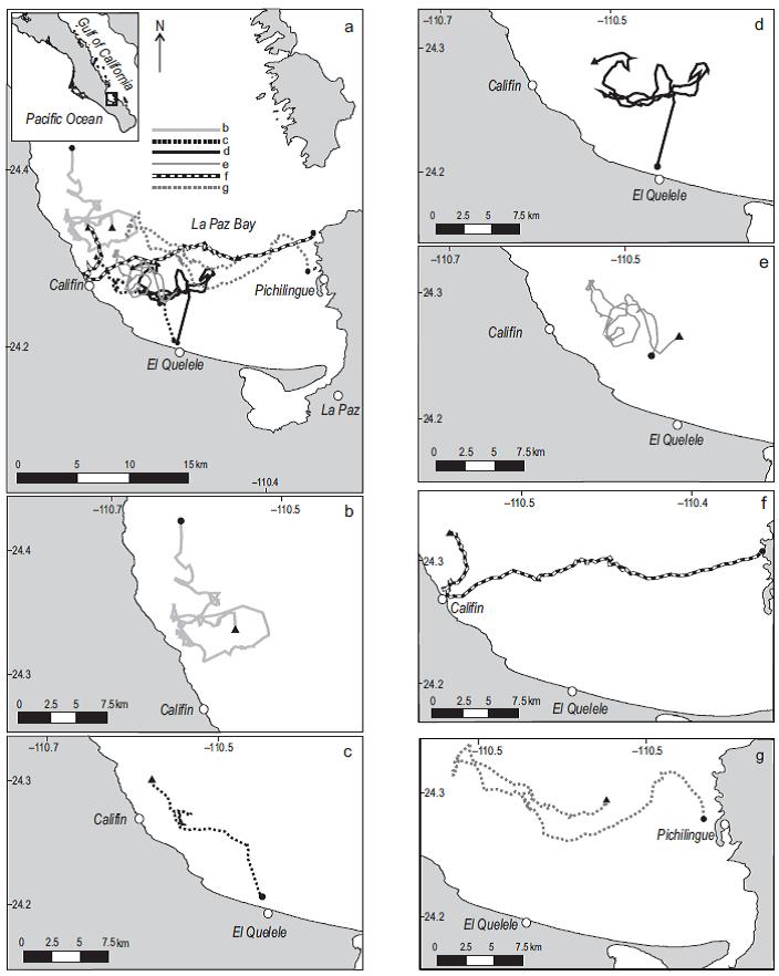 Figure 1: (a) Study area and tracking of six common dolphinfish (Coryphaena hippurus) at three locations in La Paz Bay (Mexico): (1) north of Califín, (2) Quelele, and (3) Pichilingue. (b-g) Tracks 1-6, respectively; circles indicate the start and triangles the end point.
