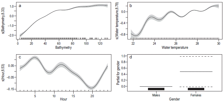 Figure 2: Generalized additive mixed models for the horizontal movements of Coryphaena hippurus. Plots show the effect of the explanatory variables (bathymetry, water temperature, hour, and gender) on the response variable (distance from shore). In (a-c), black tick marks above the x-axes indicate the distribution of data and the y-axes show the response variable on the scale of the linear predictor; the shaded areas indicate the standard error. In (d), the bars above the x-axis indicate the cumulative data for each gender, the thin horizontal lines indicate the value for the response variable (distance from shore) on the linear predictor scale, and the horizontal dashed lines indicate the standard error.