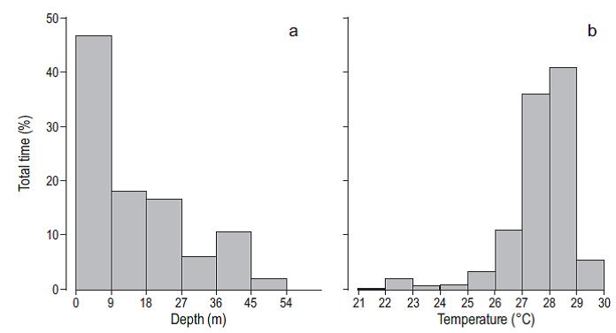 The depth range for all the tracks was 1 to 73 m. The tagged fish remained 80% of the time in the mixed layer, that is, above 34 m depth, but 45% of the time was spent in the upper 10 m (Fig. 3a). The fish spent 70% of their time in areas where water temperature was 27-28 °C (Fig. 3b). Differences were observed between the diurnal and nocturnal movement patterns. The individuals remained closer to the surface during daylight hours than during the night, as shown by the fragment of the depth time series for track 4 (Fig. 4), and a greater number of vertical immersions from the surface to depths of more than 70 m occurred during the night.