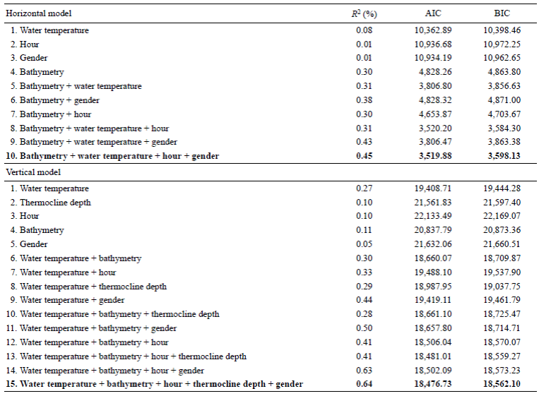 The explanatory variables were significant at P < 0.05. The model explained 64% of the deviance (R 2 = 0.6, Table 1). The most important explanatory variables were water temperature and bathymetry, followed by hour, thermocline depth, and gender.