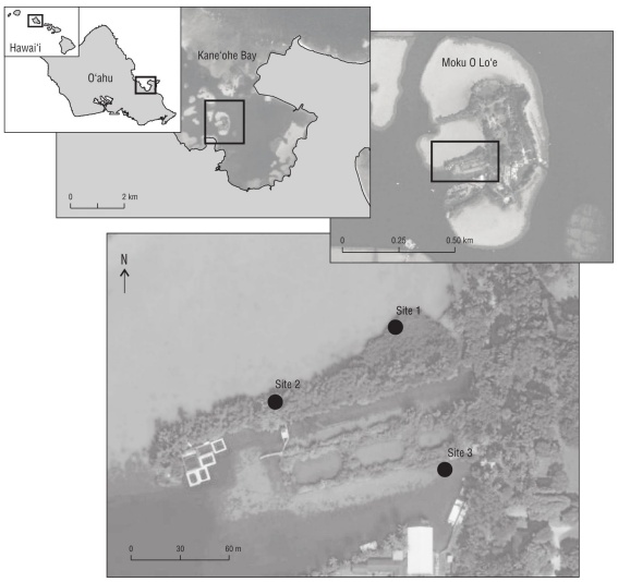Figure 1 Map of study locations at the Hawai‘i Institute of Marine Biology on Moku O Lo‘e, Kāne‘ohe Bay, O‘ahu, Hawai‘i, USA. Site 1: 21º26′01.2″ N, 157º47′20.9″ W; site 2: 21º25′59.7″ N, 157º47′23.4″ W; and site 3: 21º25′58.4″ N, 157º47′20.1″ W.