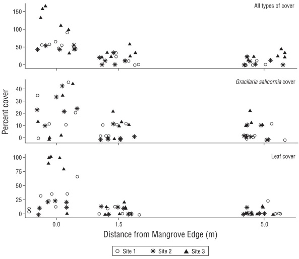 Figure 3 Total cover of benthic debris, as well as the subsets of Gracilaria salicornia cover and leaf cover, with distance (0, 1.5 and 5.0 m) from the mangrove edge at the 3 study sites. Points were jittered at each discrete distance to improve visibility.