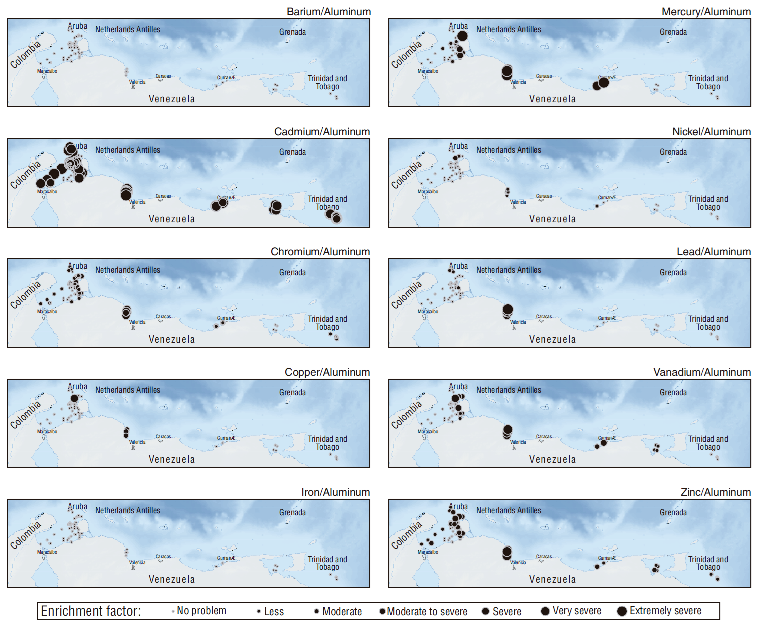 Presentamos la línea base más actualizada y extensa de contaminación por metales en los sedimentos de Venezuela. Aquí mostramos las concentraciones de 9 metales pesados (bario, mercurio, cobre, níquel, cromo, cadmio, zinc, plomo y vanadio) y el grado de contaminación que producen en diferentes zonas costeras de Venezuela. Estos resultados pueden servir como referencia para determinar la calidad de los sedimentos marinos en Venezuela y en otras áreas del Caribe.