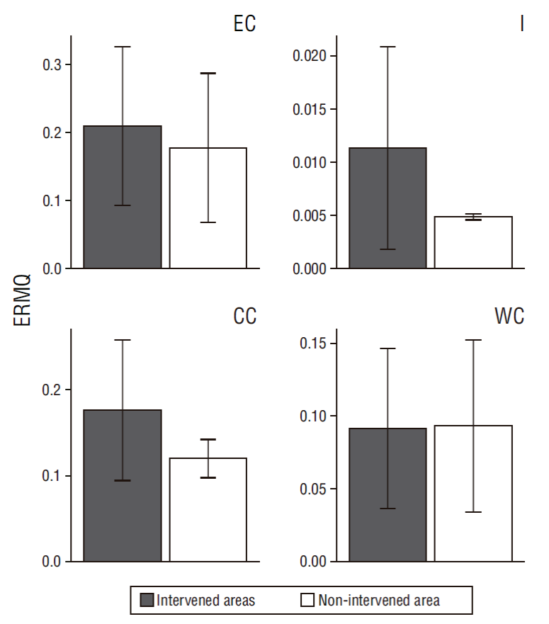 Figure 5. Mean effects range median quotients (ERMQ) in the superficial sediments of the Venezuelan coast. Error bars represent the standard deviation. EC, eastern region; I, insular region; CC, central region; WC, western region.