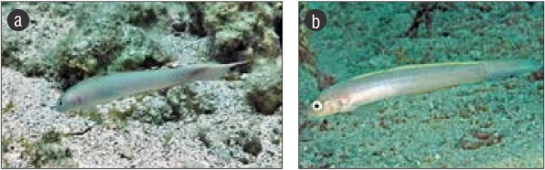 Figura 2 Ptereleotris spp. (a) Ptereleotris calliura (longitud total: 12 cm) en la laguna arrecifal de Cabezo en el Sistema Arrecifal Veracruzano, México; fotografía de MRH. (b) Ptereleotris helenae; fotografía de Graham Edgar.