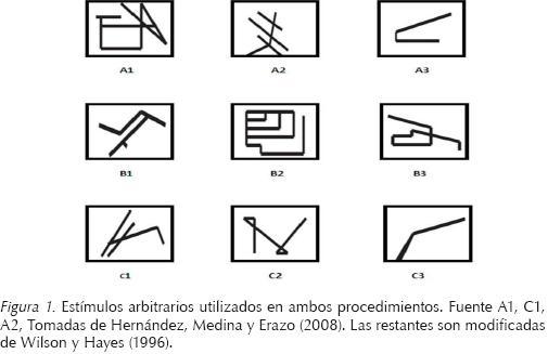 Para este experimento se utilizaron los mismos procedimientos de igualación a la muestra y Tipo-Respondiente descritos en el estudio de Delgado y Medina (2011). Al igual que en los procedimientos de Delgado y Medina (2011) en cada ensayo del entrenamiento con el procedimiento Tipo-Respondiente se presentaron pares de estímulos de la misma clase (por ejemplo, A1-B1 para la relación A-B). Cada ensayo comenzaba con la presentación de un estímulo en la mitad izquierda de la pantalla del computador (EC). Dos segundos después un estímulo adicional de la misma clase (EI) se presentaba a la derecha de éste. Ambos estímulos permanecían en la pantalla durante 2 segundos. Los ensayos del entrenamiento de igualación a la muestra sin refuerzo consistieron en la presentación de una muestra y tres estímulos comparativos. Dos segundos después, el estímulo comparativo que correspondía a la misma clase con el estímulo muestra se señalaba mediante un recuadro rojo alrededor de la figura. Ambos procedimientos comenzaban con la misma instrucción en la pantalla: "Por favor observe cuidadosamente las figuras que aparecerán en la pantalla del computador. Haga clic para continuar"