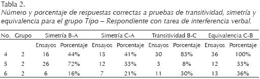 Las Tablas 1 y 2 muestran que al incluir la tarea de interferencia verbal, cuatro de seis participantes obtuvieron respuestas correctas en un porcentaje superior al 75% de los ensayos de pruebas, para al menos una de las relaciones derivadas evaluadas.