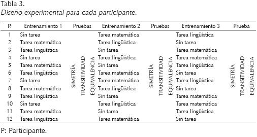 Un análisis general del desempeño en las pruebas según cada condición de tarea interferente muestra que no hay diferencias importantes en el desempeño de los participantes en las pruebas de simetría. Solamente se observa un desempeño bajo en un participante para la condición de tarea lingüística en las pruebas de relaciones simétricas. En la prueba de transitividad se observa un desempeño por debajo del criterio (75%) en 5 de 12 participantes al realizar el entrenamiento sin tarea interferente y bajo la condición de tarea lingüística, y en 4 de 12 participantes que realizaron el entrenamiento bajo el requerimiento simultáneo de la tarea matemática. Para la prueba de equivalencia, se observó un bajo desempeño en cuatro participantes al realizar el entrenamiento sin tarea interferente, en cinco para la tarea lingüística y en tres participantes que completaron el entrenamiento con la tarea interferente matemática.