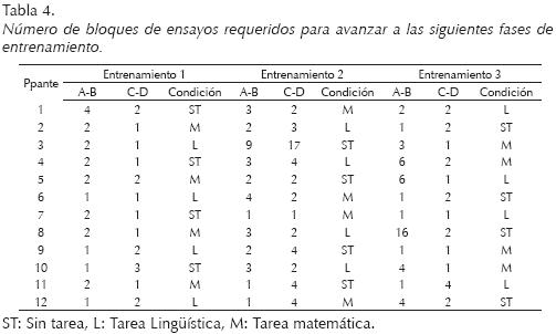 En la Tabla 4 se presenta el número de re-exposiciones a bloques de ensayos de entrenamiento requeridas por cada participante antes de alcanzar el criterio de respuestas correctas durante la fase de entrenamientos. En la mayoría de los casos cada bloque de ensayos de entrenamiento se presentó dos veces, con excepción de los participantes 3 (Entrenamiento 2, Tarea interferente lingüística) y 8 (Entrenamiento 3, Tarea interferente matemática).