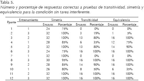 Para la condición sin tarea interferente (ver Tabla 5), se observan ejecuciones con porcentajes de precisión superiores al 75% (12/16 respuestas correctas) en las pruebas de transitividad y equivalencia en 7 de los 12 participantes.