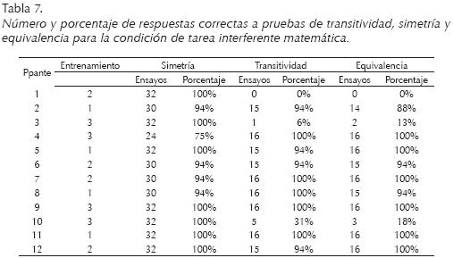 En la Tabla 7 se presentan los resultados obtenidos bajo la condición de tarea interferente matemática. Todos los participantes alcanzaron ejecuciones superiores al 75% para las pruebas de simetría, y solamente tres participantes (1, 3 y 10) no obtuvieron ejecuciones superiores al 75% en las pruebas de transitividad y equivalencia.