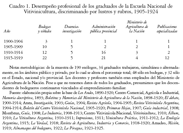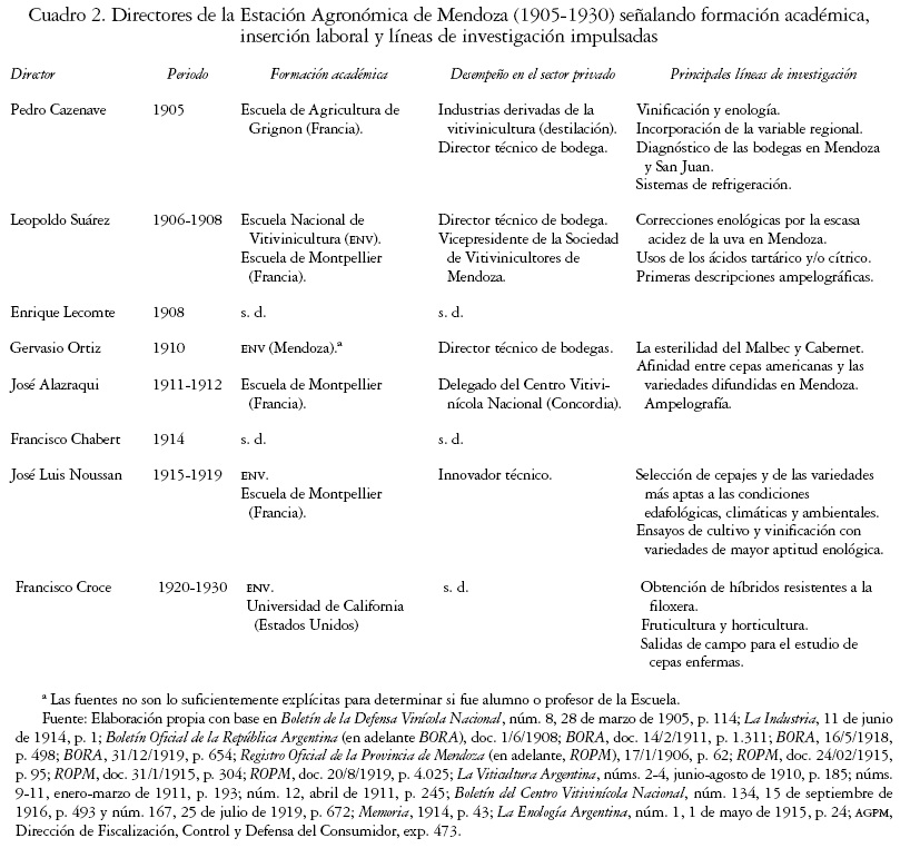 Hasta el momento, centramos nuestro análisis en los diversos proyectos y gestiones estatales para efectivizar la formación de recursos humanos especializados en vitivinicultura y agricultura, y adelantamos algunas conclusiones sobre la inserción laboral de los graduados de la Escuela Nacional de Vitivinicultura. Estamos en condiciones, entonces, de profundizar nuestro estudio en la compleja relación entre la ciencia y el aparato productivo. Para ello, es necesario conocer cuáles fueron los aportes concretos del núcleo de técnicos (extranjeros, graduados de la Escuela Nacional de Vitivinicultura y agrónomos del Estado nacional) a la modernización tecnológica y sus propuestas para la resolución de los problemas emanados de la vitivinicultura, en qué consistieron las investigaciones desarrolladas, si contaron con recursos y/o canales para difundirlas, cómo se aplicaron a las explotaciones vitivinícolas, así como también avanzar en el análisis de la constitución de este campo de especialistas.