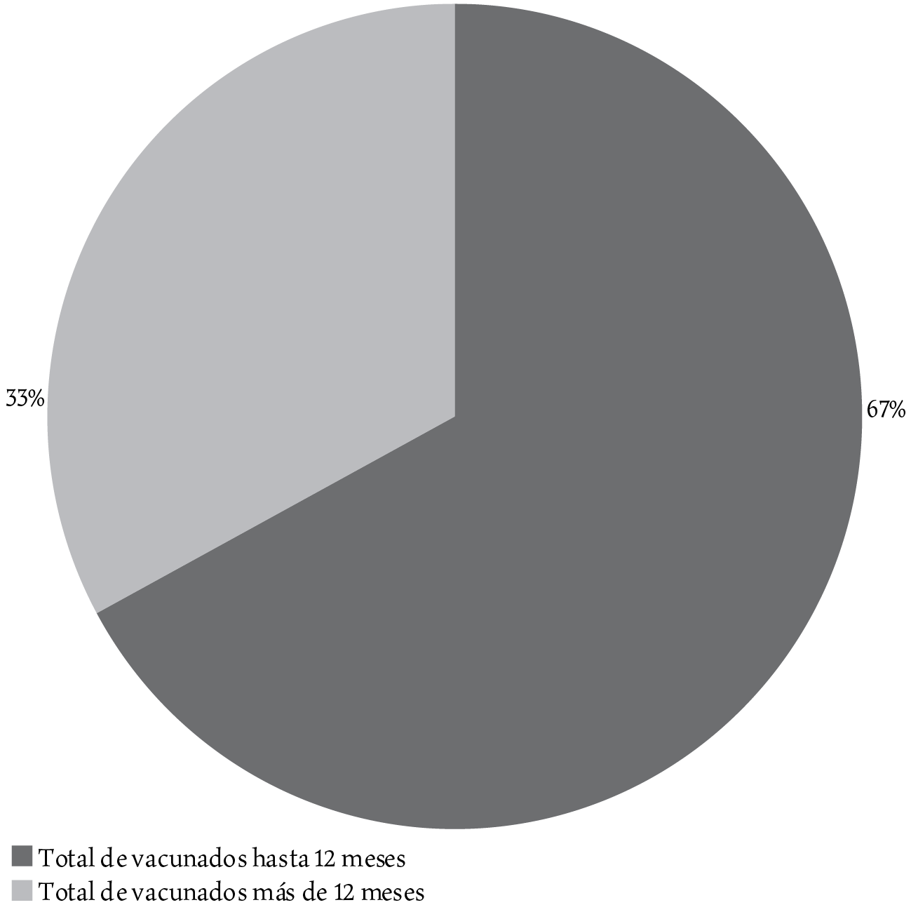 En el bienio 1816-1817 se vacunaron 983 individuos, por lo que para tener un manejo adecuado de la información se han generado dos categorías. La primera engloba a los individuos de cero a doce meses de vida, mientras que la segunda reúne a aquellos de doce meses en adelante. La razón de esta división se fundamenta en que los avisos que invitaban a vacunar a la población hacían especial énfasis en presentar a los recién nacidos.22 En 1816 se vacunó a un total de 550 individuos, de los cuales 369 fueron menores de doce meses y los 181 restantes mayores a un año (véase gráfica 1).