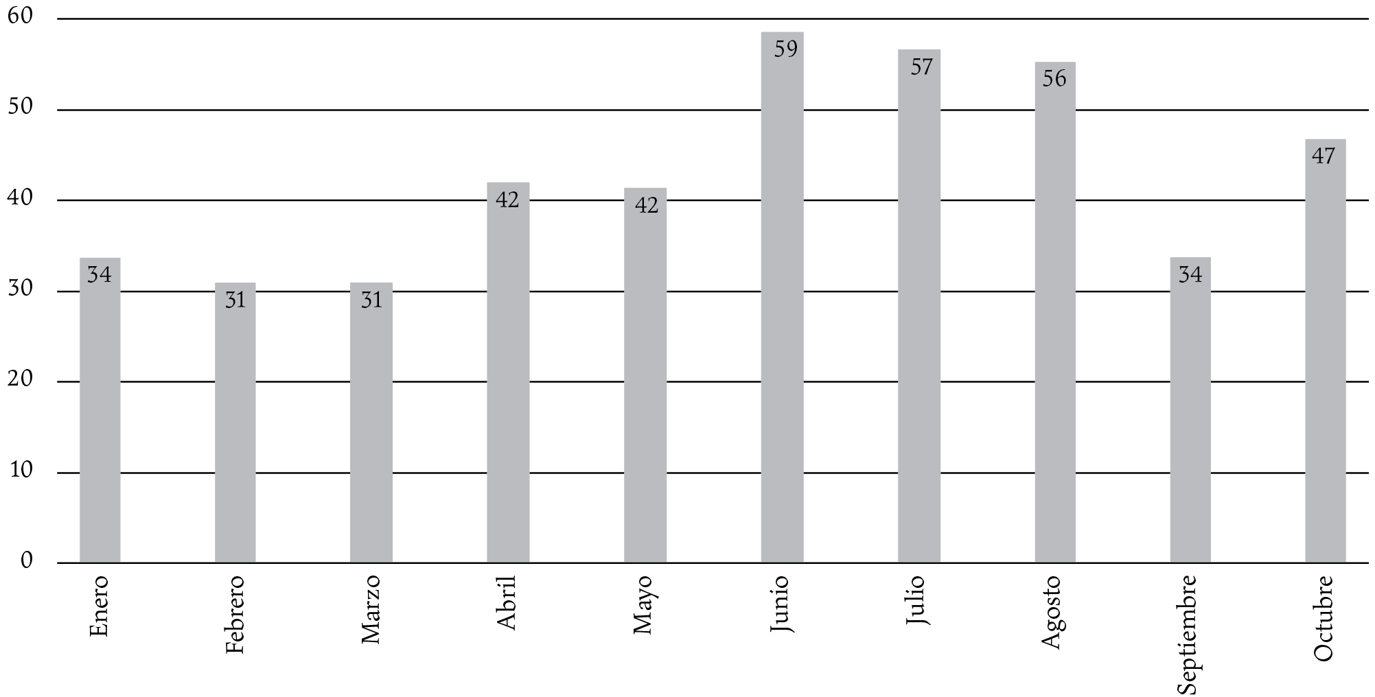 En contraste, 1817 presentó una disminución en la totalidad de individuos vacunados, no obstante, es necesario aclarar que para este año se cuenta con registros hasta el mes de octubre, por lo que es posible que con la información faltante se pudiera obtener un total de vacunaciones similar al de 1816.26 Así, el total para 1817 se situó en 433 individuos vacunados, de los cuales 329 fueron menores a doce meses y 104 mayores a un año (véase gráfica 4). El promedio de vacunados por mes fue de 43.3 individuos, aunque la distribución mensual de vacunados presenta rasgos distintos a la evidenciada en 1816, coinciden al presentar los meses más calurosos como los de mayor afluencia (véase gráfica 5). Sin embargo, al comparar ambas gráficas de vacunados por mes, octubre destaca por arrojar un repunte en la afluencia, lo que genera una incógnita que no es posible resolver a partir del resto de los documentos que acompañan los registros de vacunación.